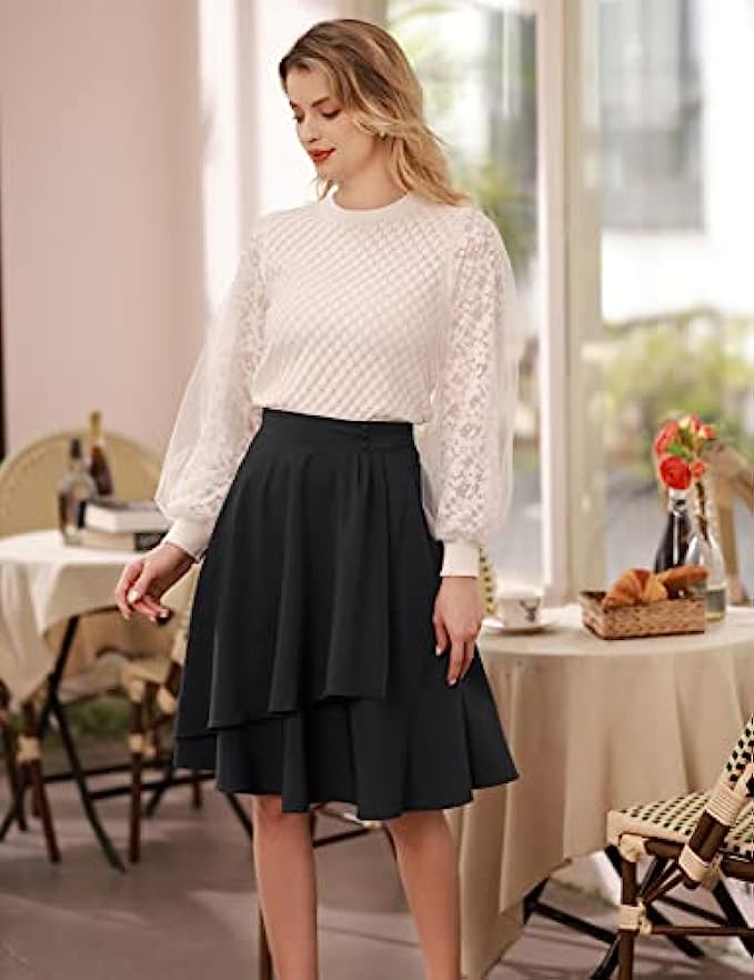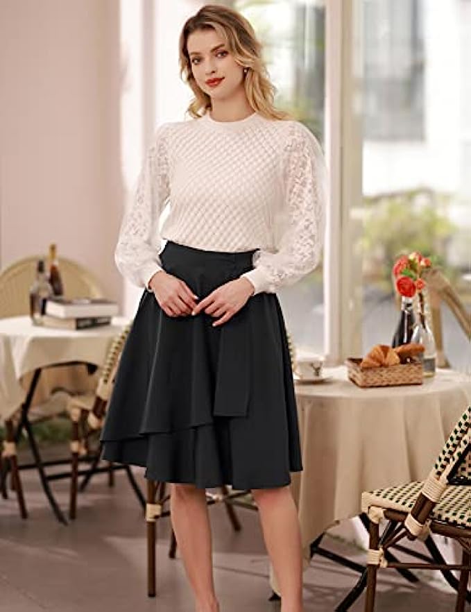 • Feature: Double-layer ruffle hem, Flowy A-line midi skirt for women, Knee-length, High-waisted wrap skirt, Pockets,Decorative buttons at the waist, is great for both dressy or casual look, can be dressed up with heels or down with flats