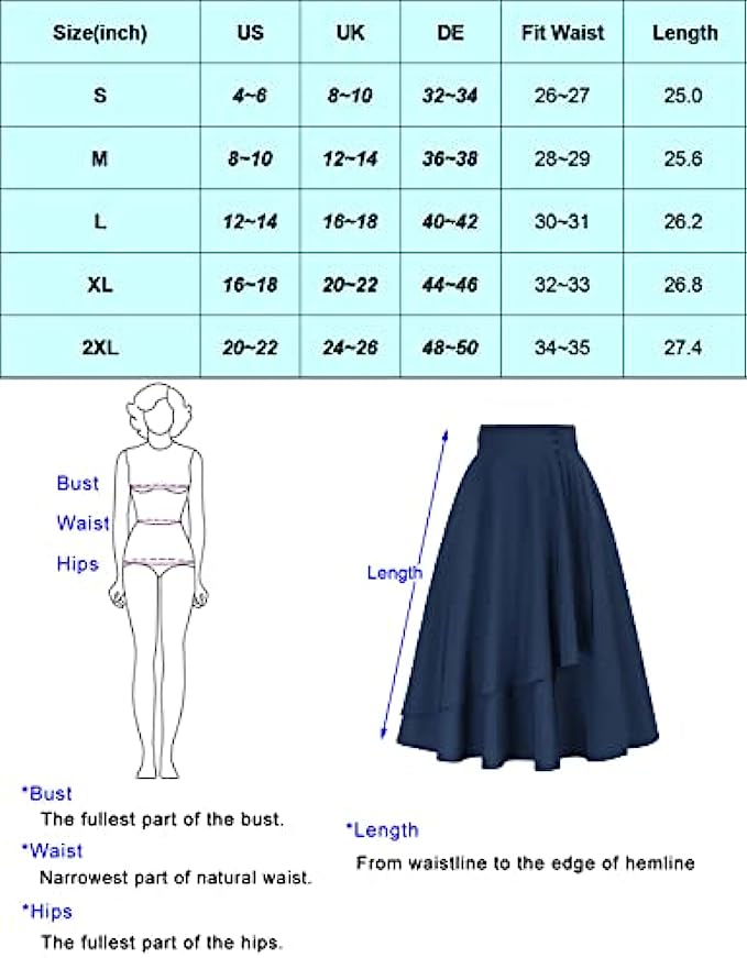 • Occasion: Simple retro solid-colored design, that will never be out of date. The high waisted skirt is suitable for dates, work, office, school, travel, party, cocktail, beach, vacations, Halloween, and daily casual. Perfect for spring, summer, and autumn, easy to match all kinds of tops
